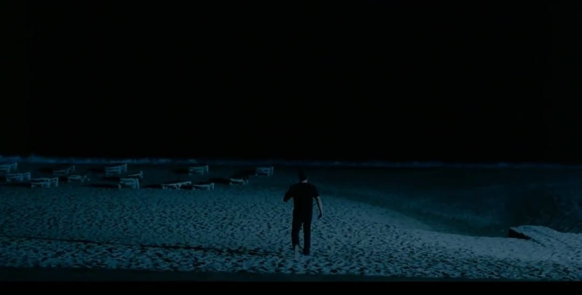 Uma das cenas do filme “Aftersun” parece permitir uma aproximação à descrição acima. Calum caminha, à noite, em direção ao mar, simulando a intenção de adentrá-lo, de perder-se nele, de que o mais forte deles prevaleça e de que se tornem um só. A câmera que, apesar da baixa iluminação, concede-nos a princípio uma visão da água e do corpo do rapaz, acaba nos deixando em meio a uma escuridão completa, que engole os nossos olhos de telespectadores. Seria, semelhante ao que Connell expressa, o modo de Calum de fantasiar com “a pálpebra serena, silenciosa, que se fecha sobre tudo para sempre”?