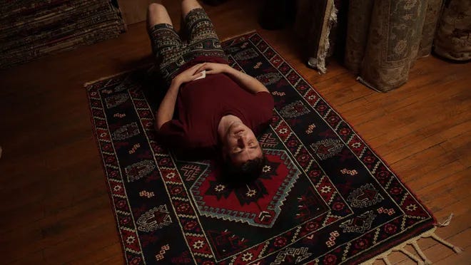 Em “Aftersun”, Calum chega a se deitar no chão em um de seus momentos de protagonismo do filme. O personagem se posiciona sobre um tapete turco pelo qual, podemos inferir, ele não tem dinheiro o suficiente para pagar, e nos permite um vislumbre de algumas das possíveis emoções que o perpassam, e que ele insiste em manter escondidas de sua filha, Sophie. Na imagem abaixo, vemos Calum, mas talvez, com um pouco de esforço, pudéssemos também enxergar Connell — ambos magistralmente interpretados por Paul Mescal.